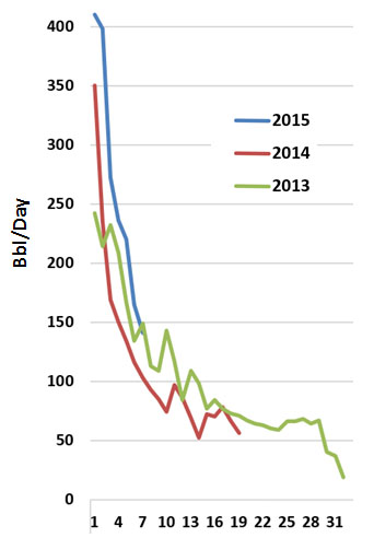 Regardless of the data source, the data used to estimate IP rates and decline curves is likely to be “messy”. That is because over time there are numerous factors that can influence the production profile of an individual well, or even a group of wells used to derive representative input variables. For example, consider the production plot of the average daily production from a group of wells in a U.S. shale play over a 33-month period shown in Figure #1. The wells for each vintage year (2013, 2014, and 2015) are plotted starting from the Month 1 position of the x-axis. That way it is possible to compare the change in performance of wells in this play over time.