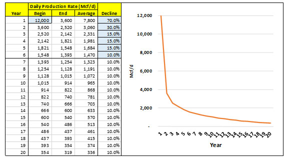 Figure #2 is an example of this method for a Haynesville natural gas well with a 12,000 Mcf/d initial production (IP) rate, a 70% first year decline, 30% second year, 15% in years 3-5, and 10% thereafter (the year 6 decline rate is extended for the life of the well). Input variables for the spreadsheet are shown in the blue cells. In this method we show the IP rate for the beginning of the year, then calculate the production rate at the end of the year by multiplying 12,000 by one minus the first year decline rate, or 12,000 * (1-.7) = 3,600. Then take the average of the beginning IP rate and end of year rate to yield the average production rate for the year (12,000 + 3,600)/2 = 7,800. The end of year number becomes the beginning of year number for year 2. The spreadsheet simply repeats that calculation for each year of the 20-year life of the well.